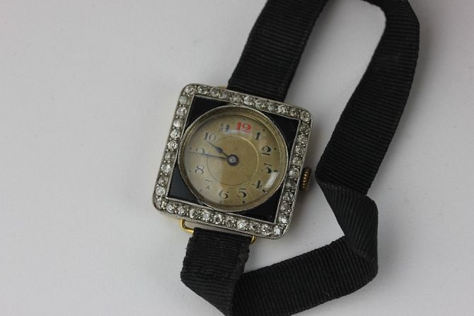 A lady's 18ct gold, diamond and black onyx cocktail watch in a square case (onyx chipped)