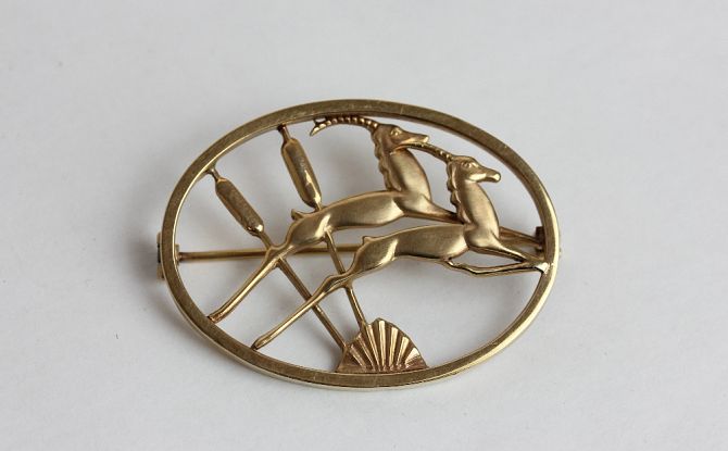 A 9ct gold brooch, by Ivan Tarratt, in the style of Georg Jensen, with two running antelope within an oval frame, stamped G.T.Ld 10.3g