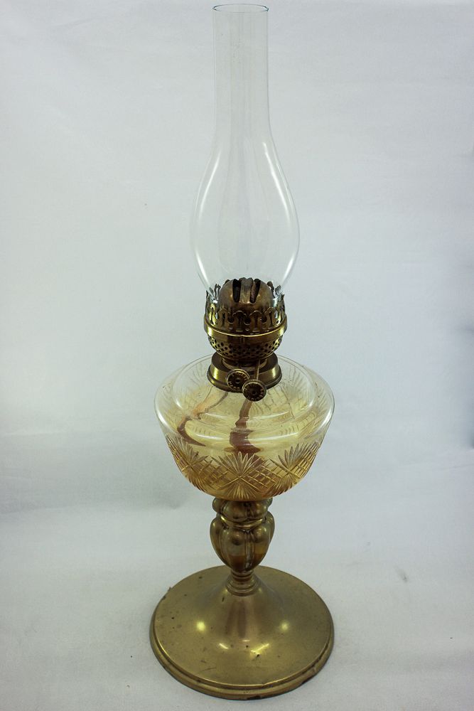 A Victorian oil table lamp with glass oil font and metal column on 'marble' base and another lamp with amber tinted glass oil font