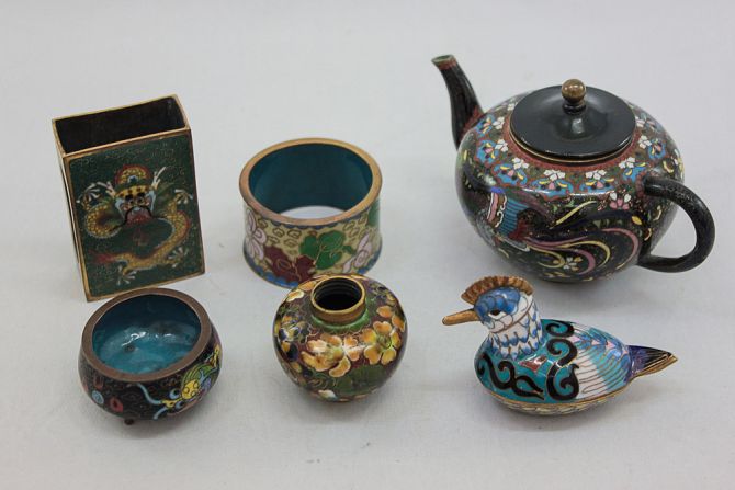 A collection of cloisonne items to include a Chinese lock; a matchbox holder; a small tea pot; napkin rings etc.; together with three measuring jugs (of varying size) and two cork pictures and a black do