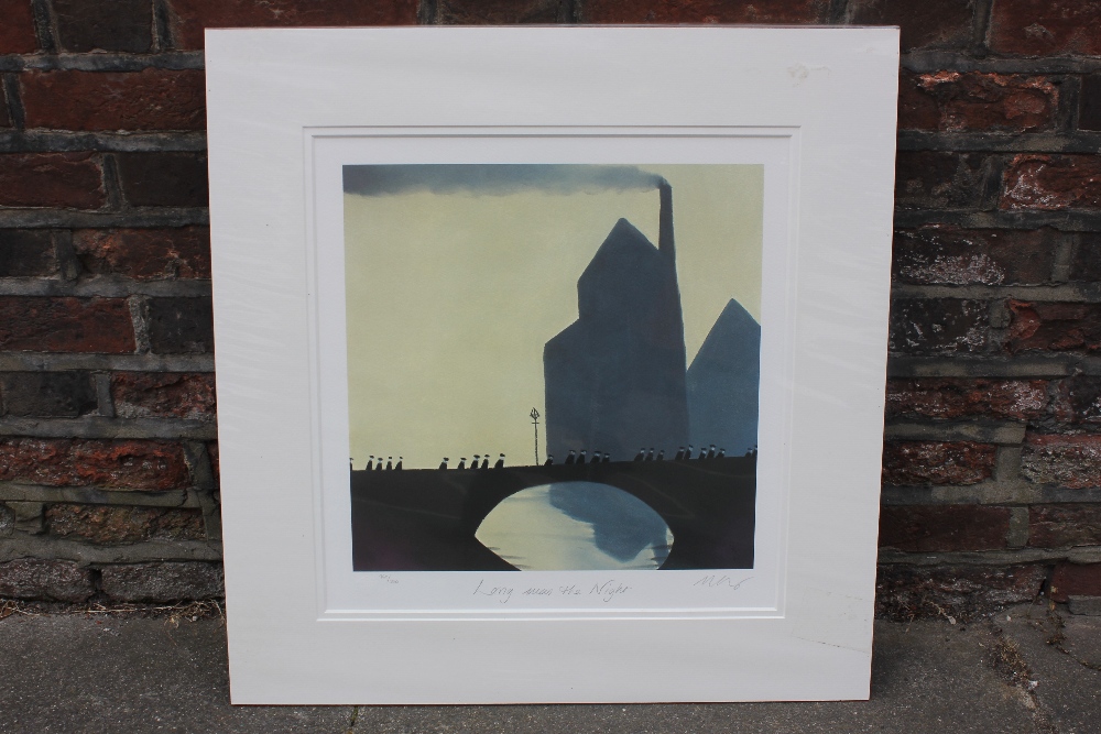 Mackenzie Thorpe, industrial landscape with figure on a bridge, 'Long was the Night', limited edition lithograph, numbered 460/850, inscribed and signed in pencil, verso Washington Green Certificate of Authenticity, 41cm by 40cm, unframed