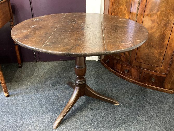 A George III oak circular tea table with tilting top on turned pedestal stem and tree legs (a/f) 87cm