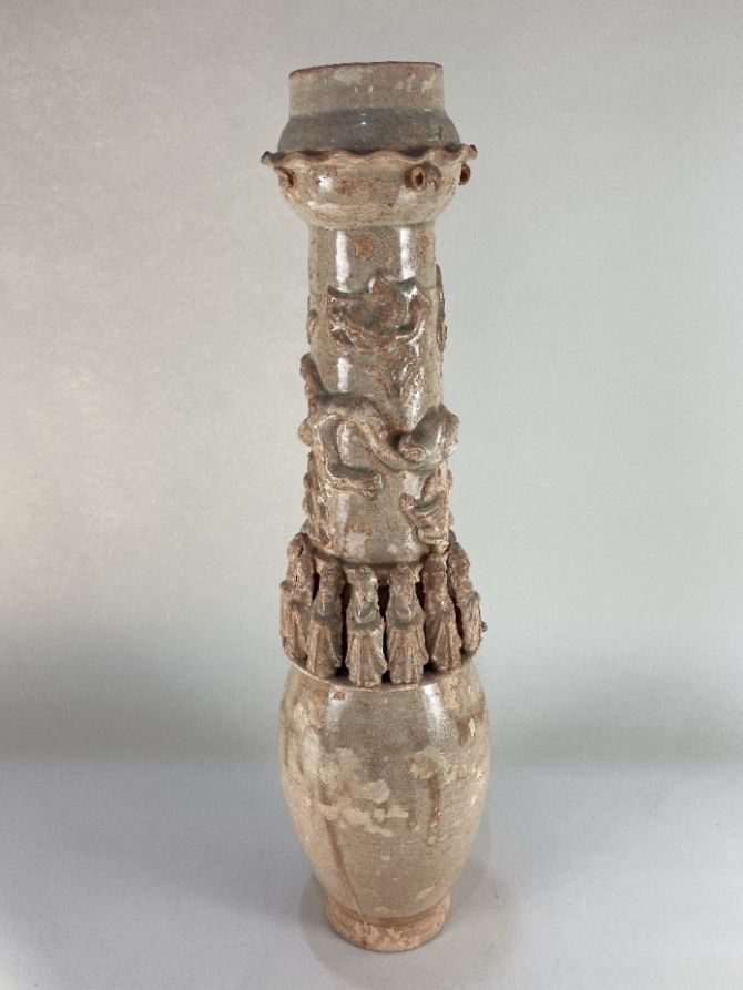 A Chinese tall glazed granary jar, possibly Northern Song Dynasty, decorated with twelve attendant figures, a dragon and other creatures, 59.5cm high (a/f)