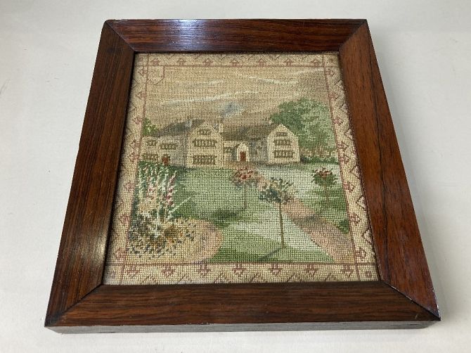 An early 19th century framed needlework of a country house with plants and trees in the foreground, dated 1814, within a geometric border, 21cm by 18cm