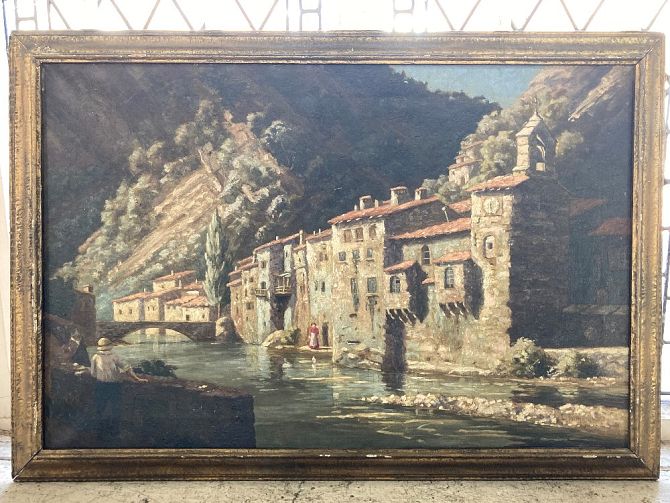 L Tomkins (early 20th century), mountainous river landscape with buildings, figure on a bridge in the foreground, oil on canvas, signed and indistinctly dated 19*5, 50cm by 76cm