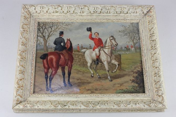 Edward Benjamin Herberte (1857-1893), hunting scene with two riders exchanging a greeting in the foreground, oil on board, signed and dated 1887, 23cm by 30.5cm