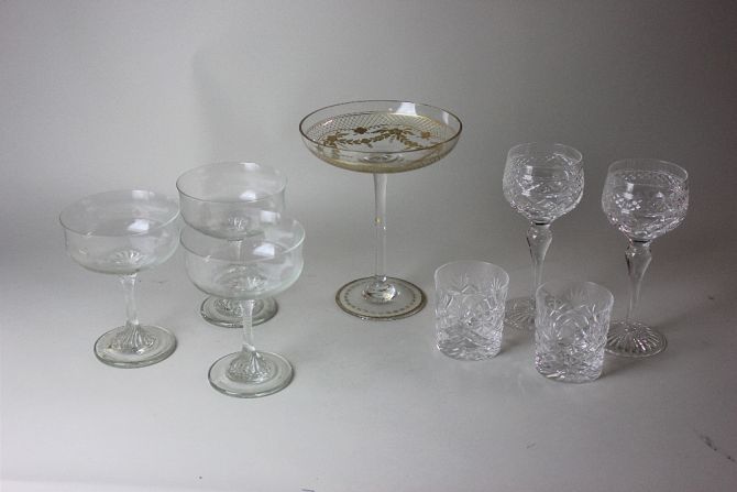 A gilt-incised glass comport, possibly French, decorated with flowers and swags, 16.5cm diameter, a pair of Thomas Webb glass tumblers, a pair of Stuart crystal wine glasses and three stemmed sundae glasses (8)