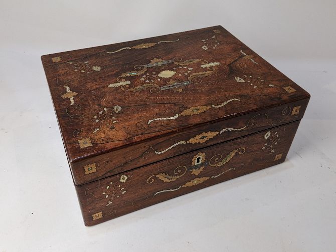 A Victorian rosewood jewellery box with brass, mother of pearl and abalone inlaid lid and front, fitted interior with green lining, 30.5cm