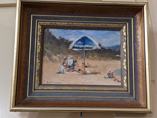 Avril Foenander, figures at the beach with blue umbrella, 'Terrigal Sea Scape', oil, signed, inscribed paper labels verso, 13.5cm by 18.5cm