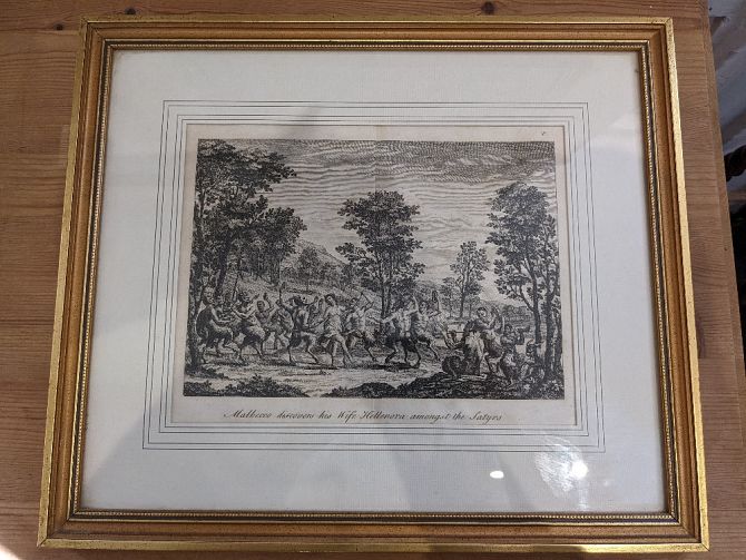 After William Kent (1685-1748), a framed engraving of figures dancing in a landscape, 'Malbecco discovers his wife Hellenora Amongst the Satyrs', from The Faerie Queene Book V, by Edmund Spenser (1552-99), 19cm by 24.5cm