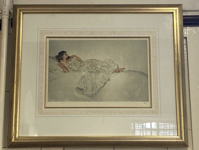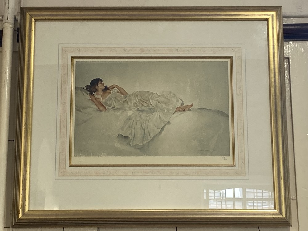 After Sir William Russell Flint, Celia Reclining, colour print, numbered 219/850 in pencil and blind stamped, 26cm by 38cm