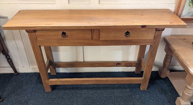 A modern pine side table with rectangular top above two drawers, on block legs with uniting stretcher, 134.5cm