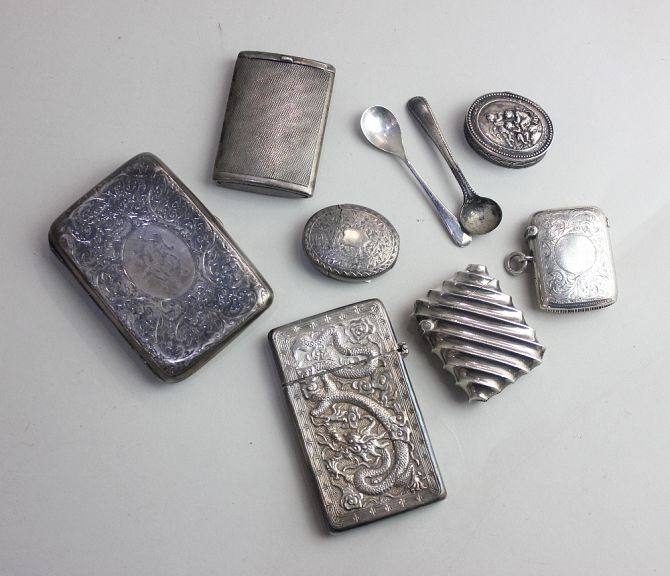 A Victorian silver vesta case with deep ribbed design, three other various silver vestas, a cigarette case, oval pill box, two cruet spoons and a Chinese whiite metal card case (a/f) 8oz