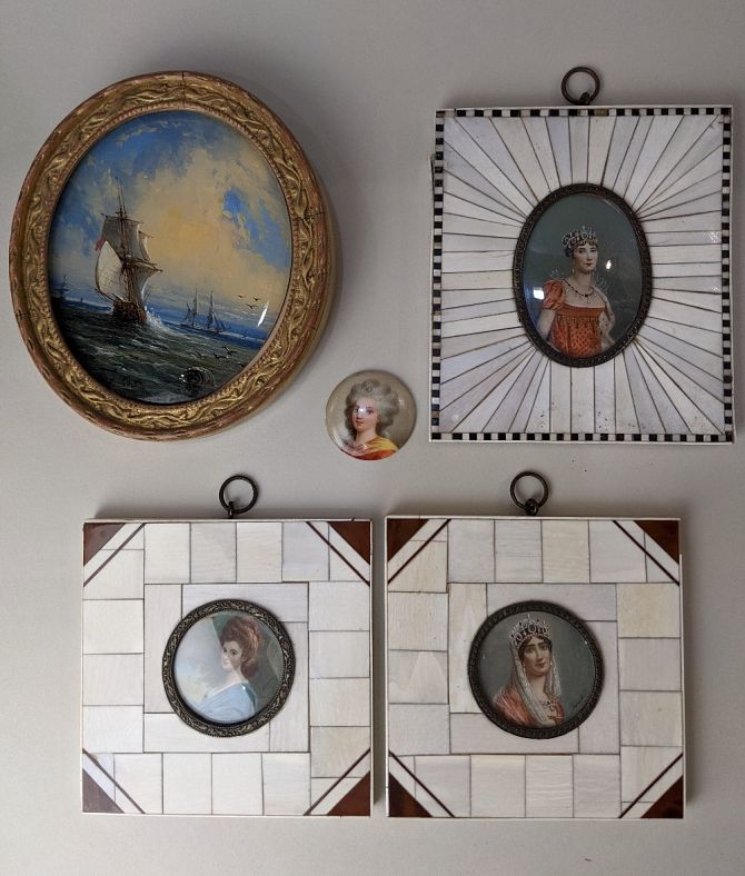 Three 19th century portrait miniatures of ladies after Dupre, Gerard and Rowney, each bearing inscribed signature, in piano key frames, largest 12cm by 10.7cm including frame, together with an oval maritime view after G Coretti, 10cm by 8.5cm, and a circular miniature portrait on porcelain, 3.5cm diameter (5)