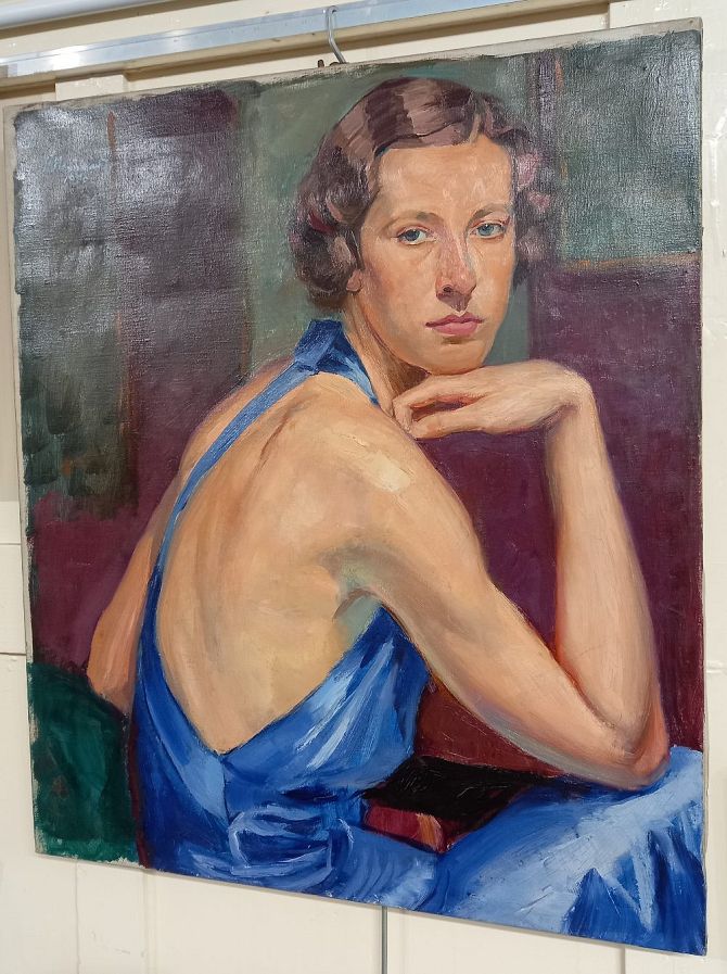 Hugo von Bouvard (Austrian 1879-1959), portrait of a lady wearing a blue gown looking over her shoulder, believed to be the artist's daughter Nora, oil on canvas, signed and dated 1936, 70cm by 59.5cm (ARR)