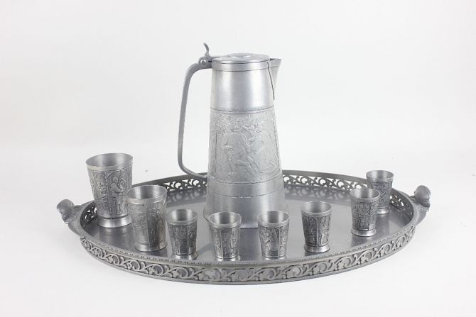 A Royal Holland Daalderop pewter drinking set, comprising jug, eight various cups and an oval tray