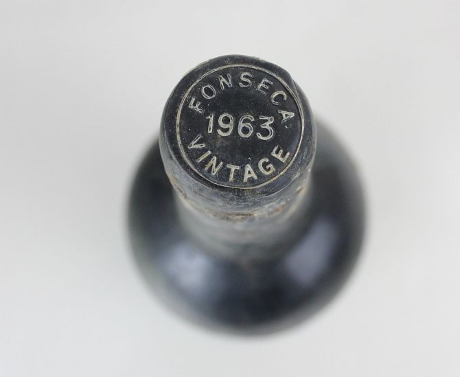 A bottle of vintage port by repute Fonseca 1963 missing paper label, with embossed cap provenance: purchased from Christies in the 1970s