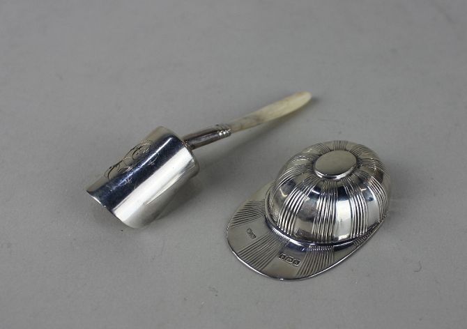 A Edward VII silver jockey cap caddy spoon maker William Neale Birmingham 1909 and a shovel shaped silver caddy spoon with engraved initial, maker Hayes and Co. Birmingham 1908