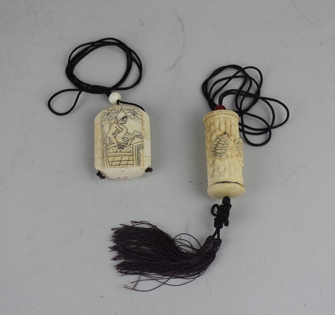 Two Japanese inro, one carved with turtles, the other decorated with an erotic scene and two birds