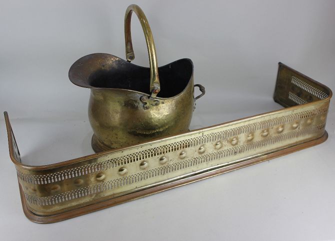 A brass helmet shaped coal scuttle and a pierced brass fire fender, 94cm