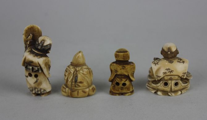 Four Japanese netsuke of men in various poses, one signed, four with fans, tallest holding a mask 4.5cm high