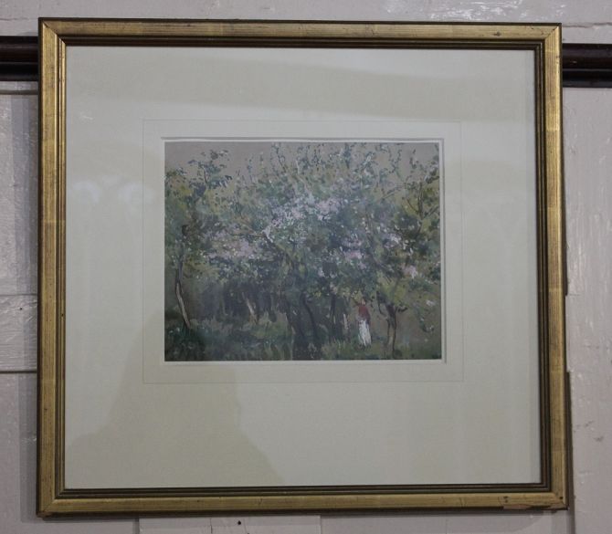 Follower of Archibald George Barnes (1887-1972), figure in an orchard, gouache, unsigned, verso later pencil inscription, 21cm by 26cm