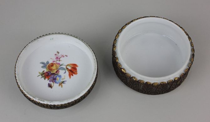 A gilt metal mounted porcelain pot and cover, the lid encrusted with forget-me-nots and roses 13cm diameter