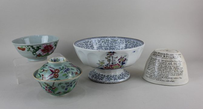 A Brown & Polson's Corn Flour Blanc Mange pottery jelly mould, printed with recipe 12cm high, two Chinese Cantonese celadon bowls, one with cover, and an ironstone fruit bowl with floral decoration 27cm diameter (a/f)