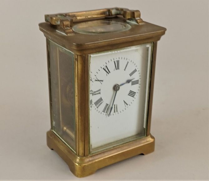 A French brass and bevelled glass cased carriage clock by R & Co. Paris, 14cm high, with key