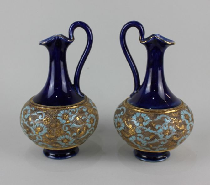 A pair of Royal Doulton Slaters Patent jugs, blue glazed with band of textured floral decoration and gilt embellishments, 24cm high