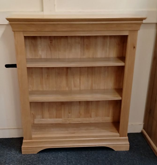 A modern light wood open bookcase of three shelves on bracket base, 94cm