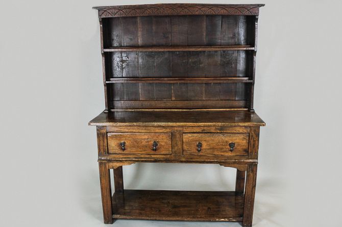 A small oak dresser with open display shelves above base with two drawers and pot board base, 126cm wide by 165cm high