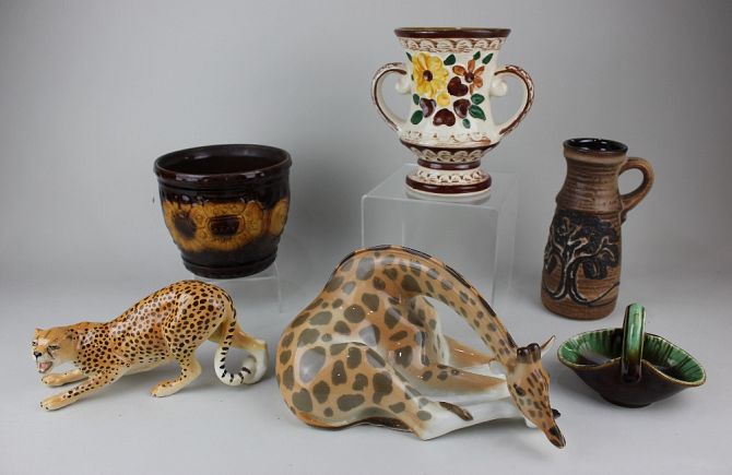 A Beswick model of a cheetah 11.5cm high and a USSR ceramic model of a giraffe 15cm, together with a West German pottery jardiniere, urn, and vase, and a German pottery trinket basket