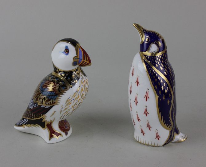 Two Royal Crown Derby Imari porcelain paperweights of a puffin and a penguin, both with silver stoppers