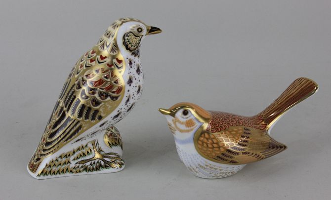 Two Royal Crown Derby porcelain paperweights of a song thrush and a nightingale, both with gold stoppers, both boxed