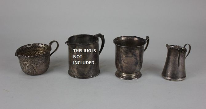 A Victorian and an Edward VII silver cream jug of various design and a christening mug with scroll handle and engraved initials, London 1909, 5.5oz