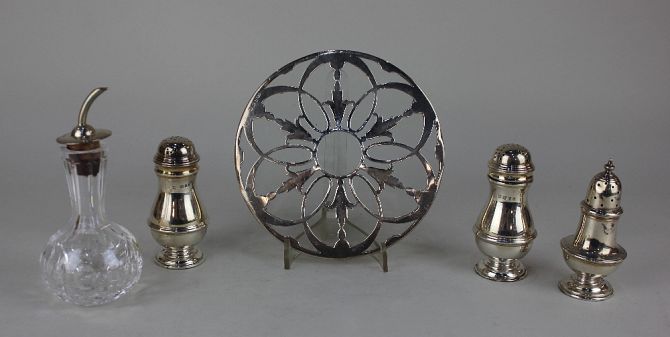 A Victorian silver pepper pot baluster shape, London 1891, a pair of modern silver peeper pots, London 1970, a silver lidded glass vinaigrette bottle and a silver mounted circular glass table stand, (a/f) 14.5cm weighable silver 6.5oz