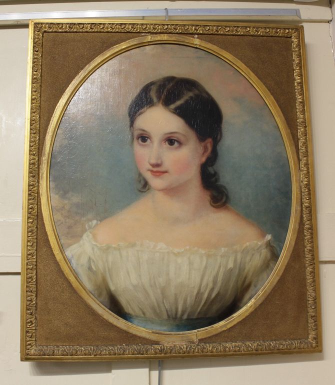 Follower of John Wood (1801-1870), head and shoulders portrait of a young lady dressed in white, by repute Fanny Eliza Graham, wife of William Wordsworth, son of poet William Wordsworth, oil on panel, unsigned, verso inscribed paper label, in oval mounted gilt frame, oval measures 59cm by 48cm