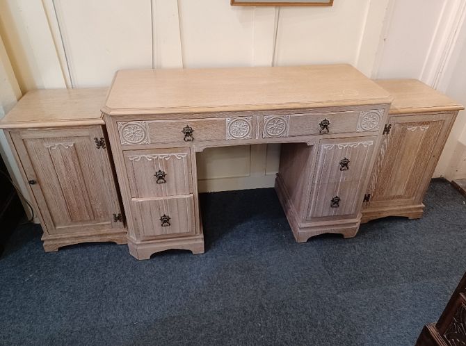 A limed oak part bedroom suite comprising dressing table and pair of bedside cupboards with carved linen fold decoration on bracket feet dressing table 115cm