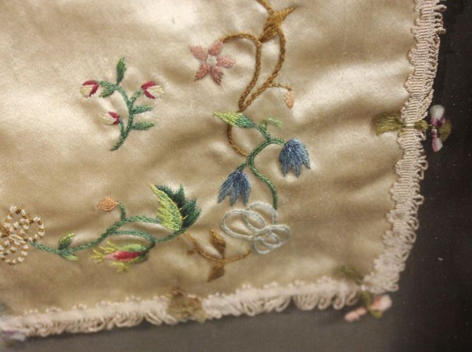 A framed 19th century and later needlework bag, with floral decoration, frame 57cm by 36.5cm, by repute through the Simcox Lea family