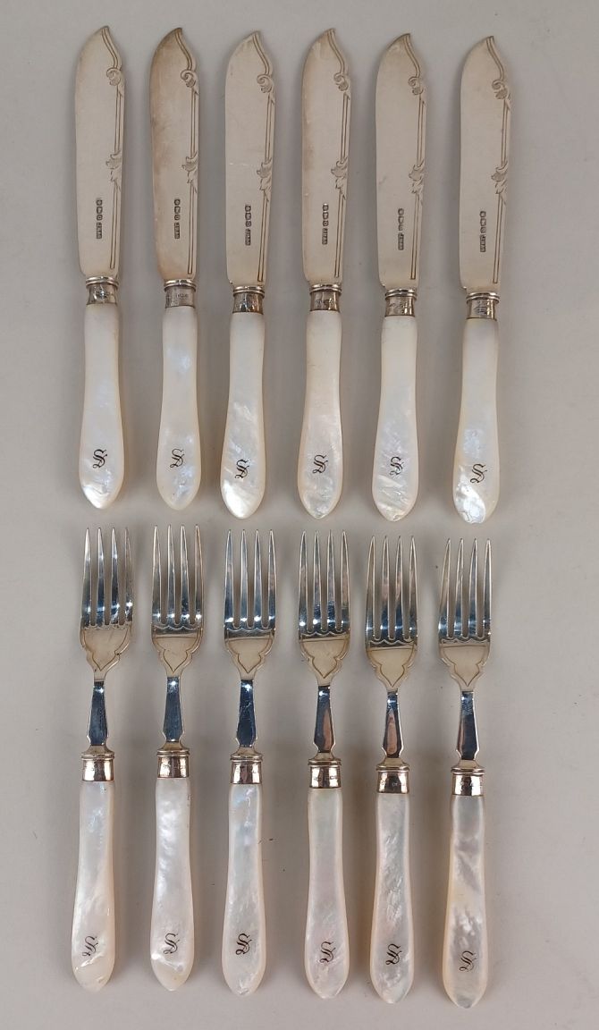 A set of six pairs of George V silver fish knives and forks with mother of pearl handles with initial S , a/f (one knife handle damaged), maker Joseph Rodgers & Sons, Sheffield 1931, gross wt 18oz