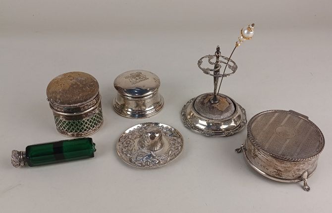 An Edward VII silver dressing table box with green glass liner, two other dressing table boxes, silver hatpin stand Chester 1906, glass scent bottle (a/f) and a sterling silver Mexican hat dish, 8cm