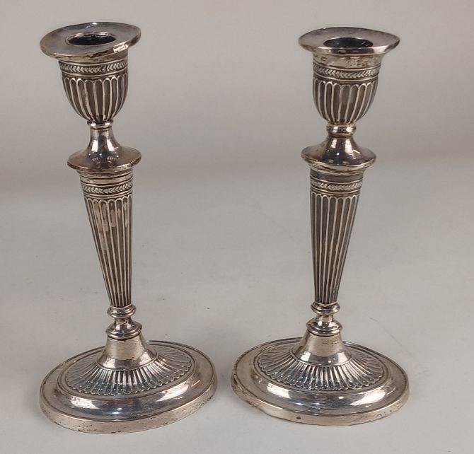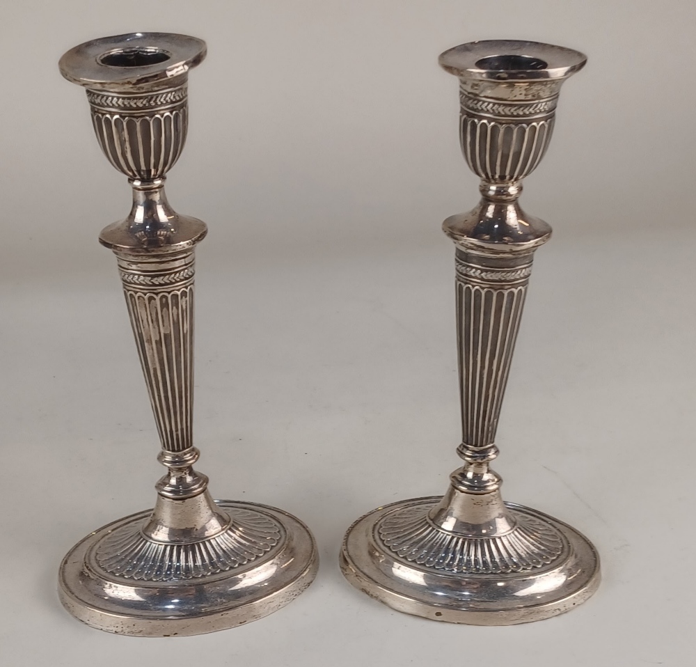 A pair of Edward VII silver candlesticks urn sconces on fluted tapering stem and loaded oval bases, (a/f) maker William Aitken Birmingham 1902, 20cm