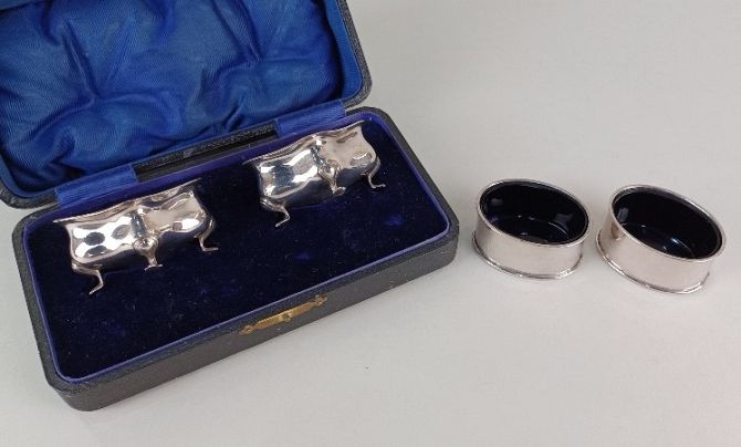 A pair of George V silver salt cruets lozenge form on four paw feet, maker James Deakin, Chester 1911, and a pair of George V silver oval salt cruets with blue glass liners, Birmingham 1918, 3.4oz