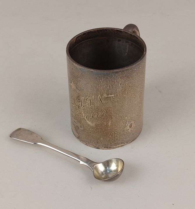 An Edwardian silver christening mug with engraved initials and date, London 1902 and a William IV silver mustard spoon, 3.9oz