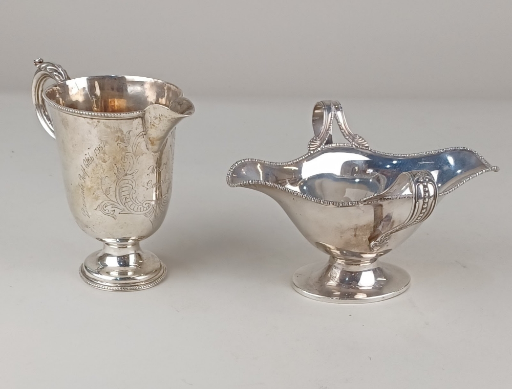A Victorian silver cream jug with scroll handle and later presentation inscription, maker Henry Wilkinson & Co. Sheffield, 1872 An Edwardian silver sauce boat with double spout and twin loop handles, maker Barker Brothers Chester 1906, 6.7oz
