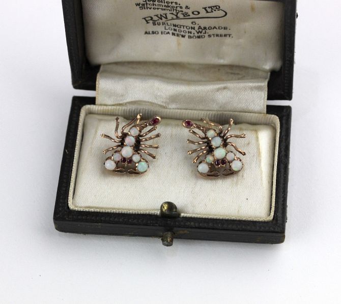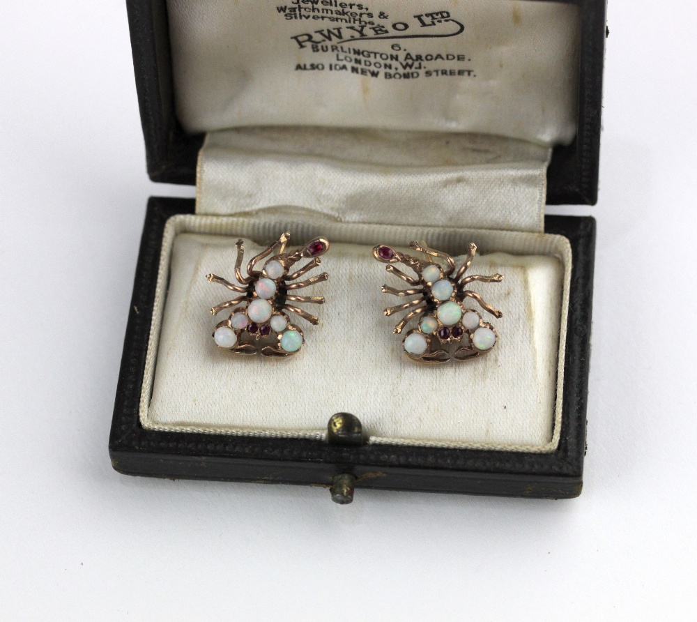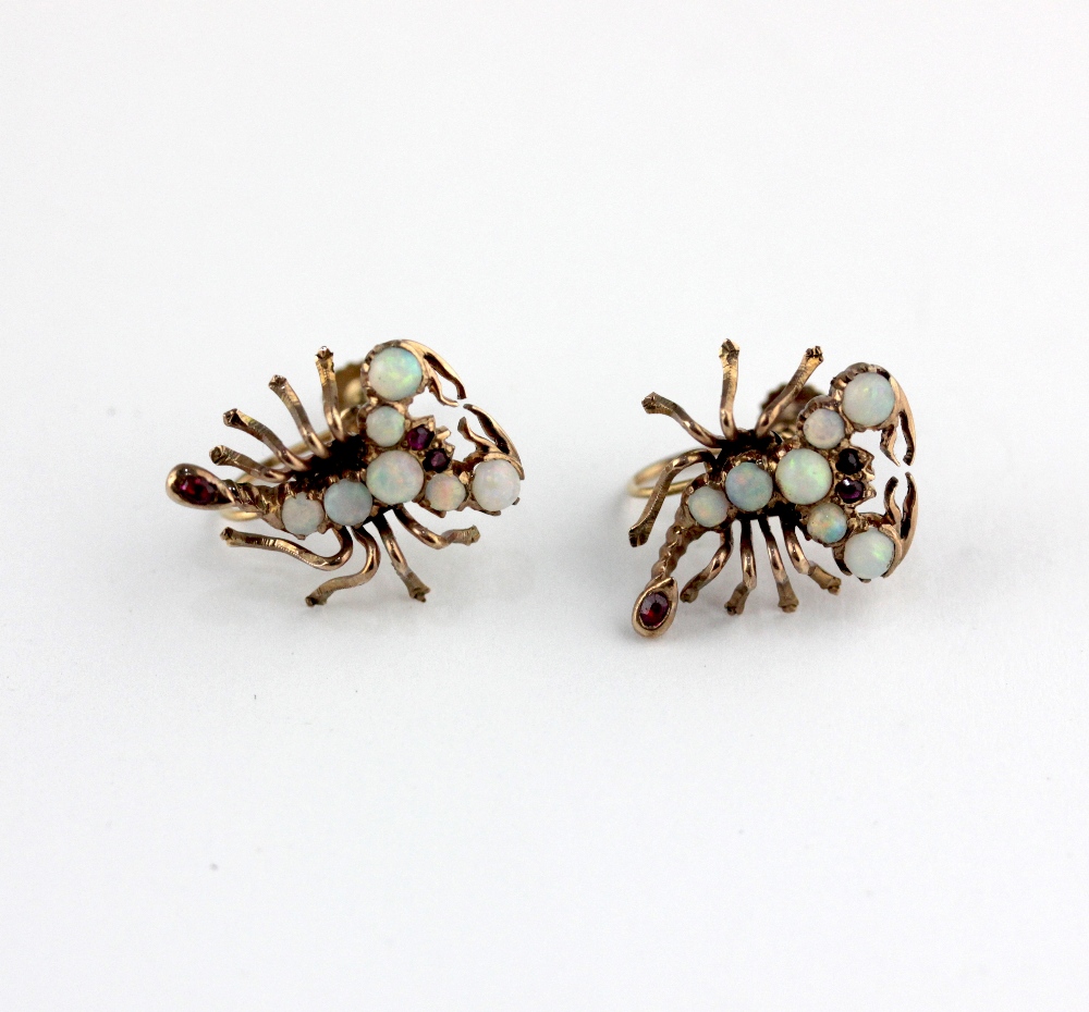 A pair of ruby and opal scorpion earrings, set in 9ct rose gold, with screw fittings, in a fitted box, gross weight 4.9g