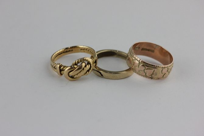 An 18ct gold ring in a woven knot design, ring size N, a 9ct gold wide band wedding ring with engraved decoration, Birmingham 1903, ring size O, and a 9ct gold and diamond ring with pierced decoration ring size L 1/2