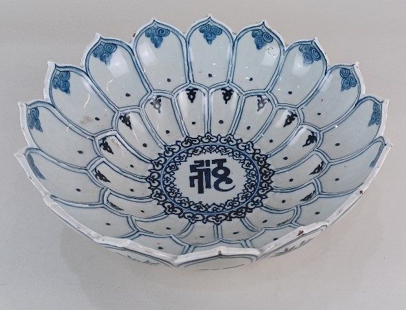 A Chinese blue and white lotus shaped bowl, for the Islamic market, with character marks to base 30.5cm diameter