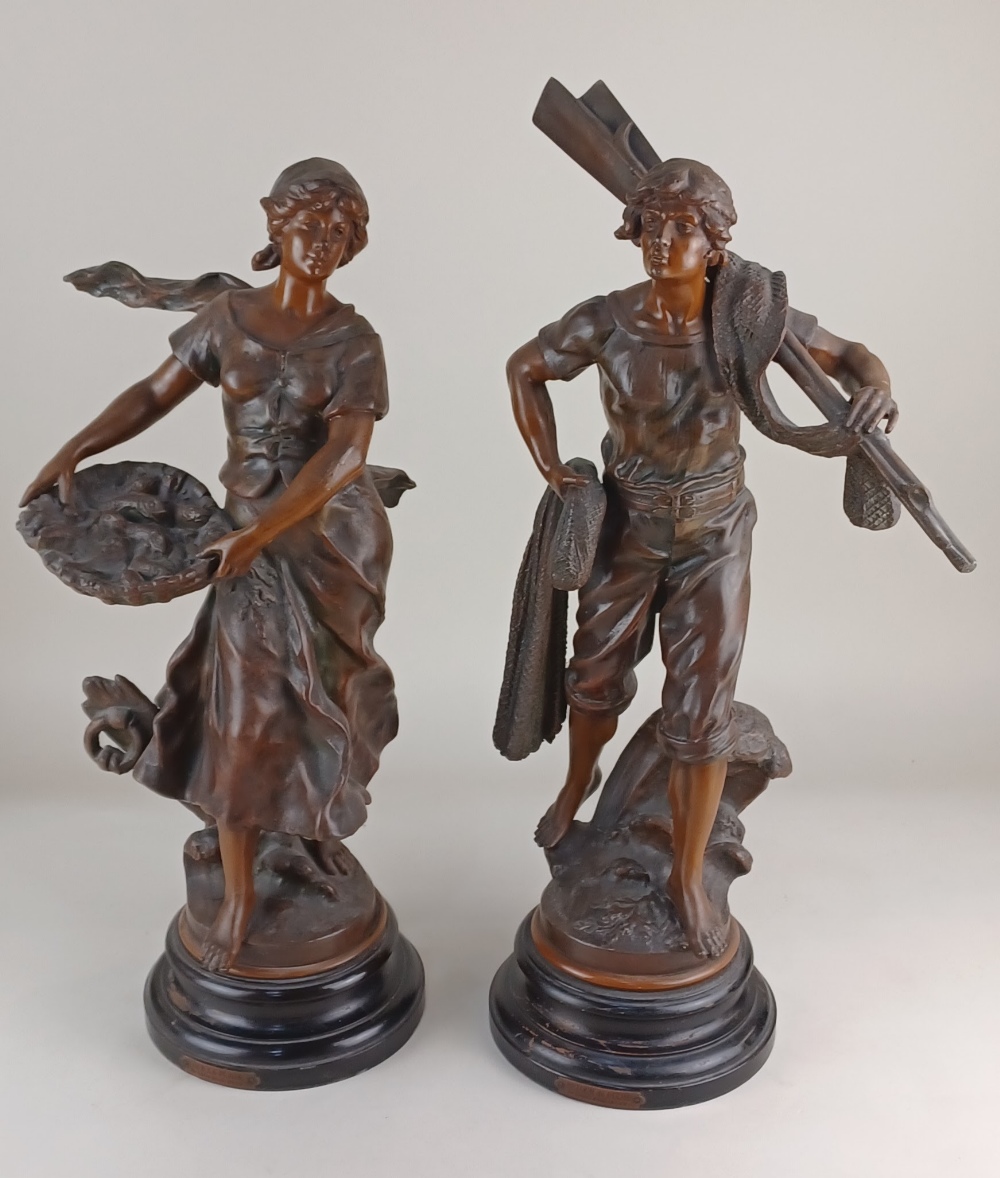 After Moreau, a pair of bronzed spelter figures of Fisherfolk; 'Return from Fishing' and 'On the Beach', the man with oars and netting, the lady with basket of fish, both signed Franc Moreau, both on socle base with inscribed plaque, tallest 58cm high including base